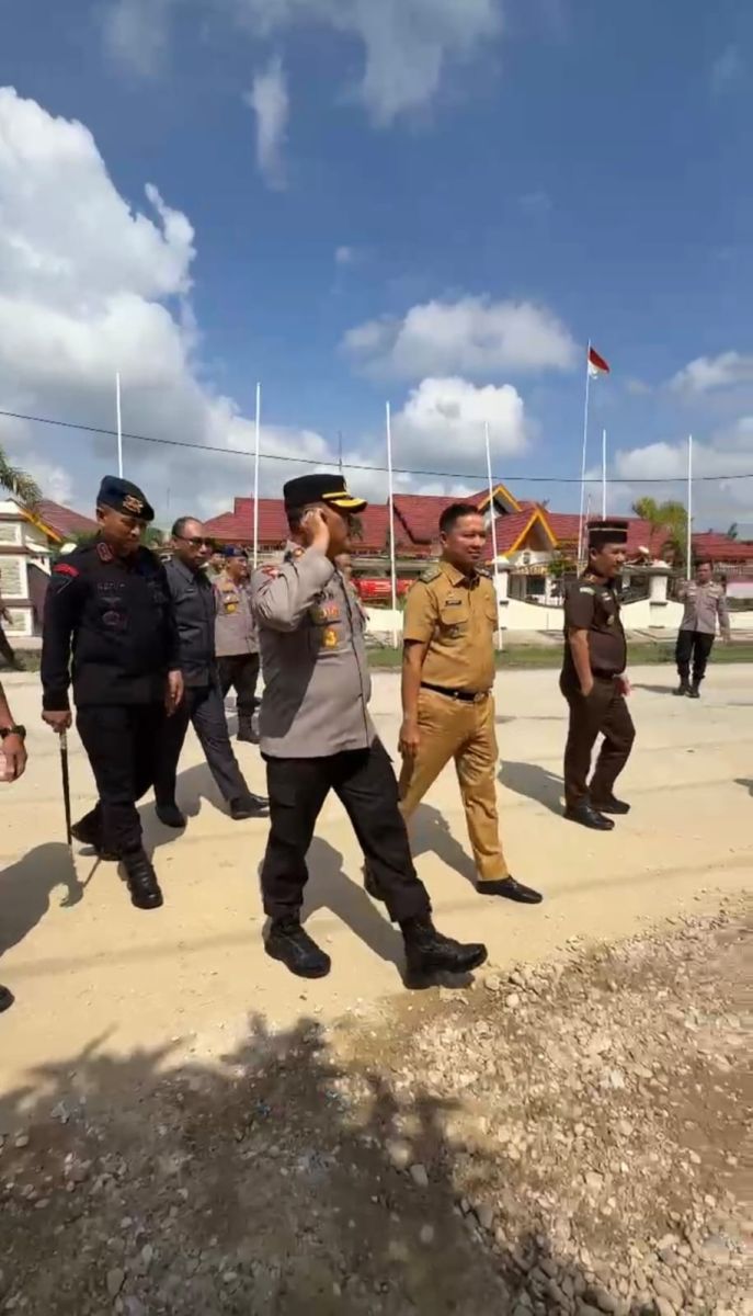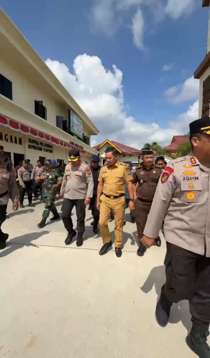 Keterangan Foto: Wakil Bupati Pelalawan Husni Thamrin, S.H. bersama Kapolres Pelalawan AKBP Jhon Louis Letedara, S.I.K., Dansat Brimob Polda Riau Kombes Pol I Ketut Gede Adi Wibawa, dan jajaran Forkopimda meninjau langsung pelaksanaan simulasi pengamanan