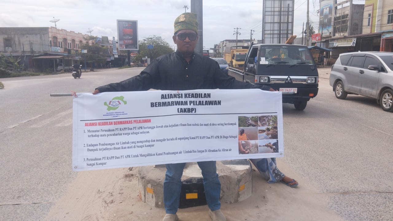 PELALAWAN, (Mata Andalas) — Seorang pemuda berbusana adat Melayu lengkap dengan tanjak melakukan aksi demonstrasi tunggal di tiga lokasi berbeda pada Senin (24/11/2025), menuntut kejelasan dan akuntabilitas atas matinya ribuan ikan di Sungai Kampar, Desa Sering, Kecamatan Pelalawan..jpg)